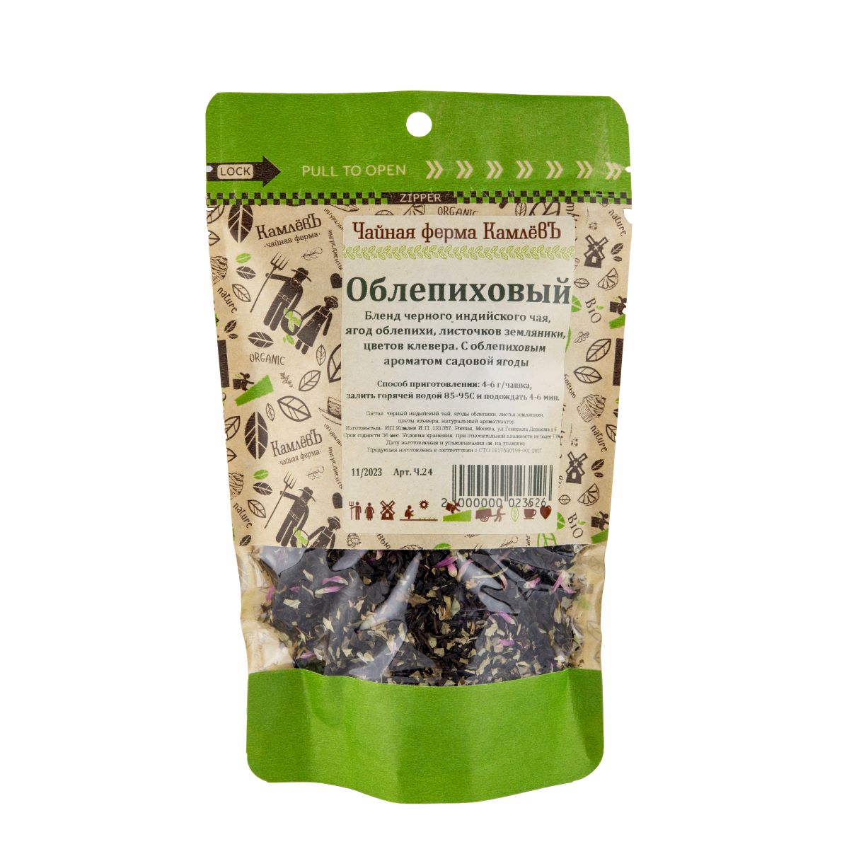 Бленд крупнолистового черного индийского чая, ягод облепихи, листочков земляники, цветов клевера. С облепиховым ароматом садовой ягоды.