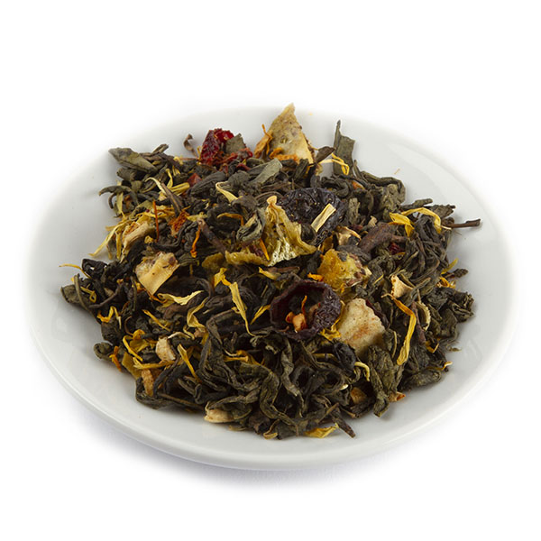 - Cостав: Бленд крупнолистового зеленого китайского чая, кусочков киви и банана, цедры апельсина, шиповника и лепестков календулы.