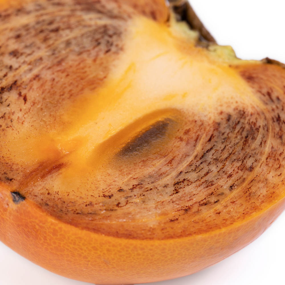 У хурмы сорта Шоколадная характерная мякоть тёмного цвета с крупными косточками. Ягоды очень сладкие и при этом почти не имеют вязкого привкуса даже у недозревших плодов.