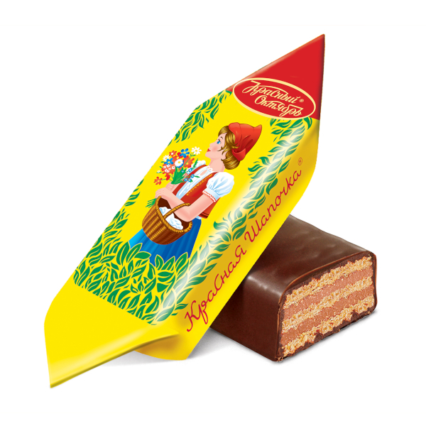 Знаменитые на весь мир конфеты «Красная Шапочка» от фабрики «Красный Октябрь». Знакомый каждому, даже не большому любителю сладостей желтый фантик со сказочной девочкой, внутри него – несколько слоев хрустящих тонких вафель, прослоенных ароматным пралине и покрытых волнистой шоколадной глазурью. Вкус и аромат, знакомые с детства!