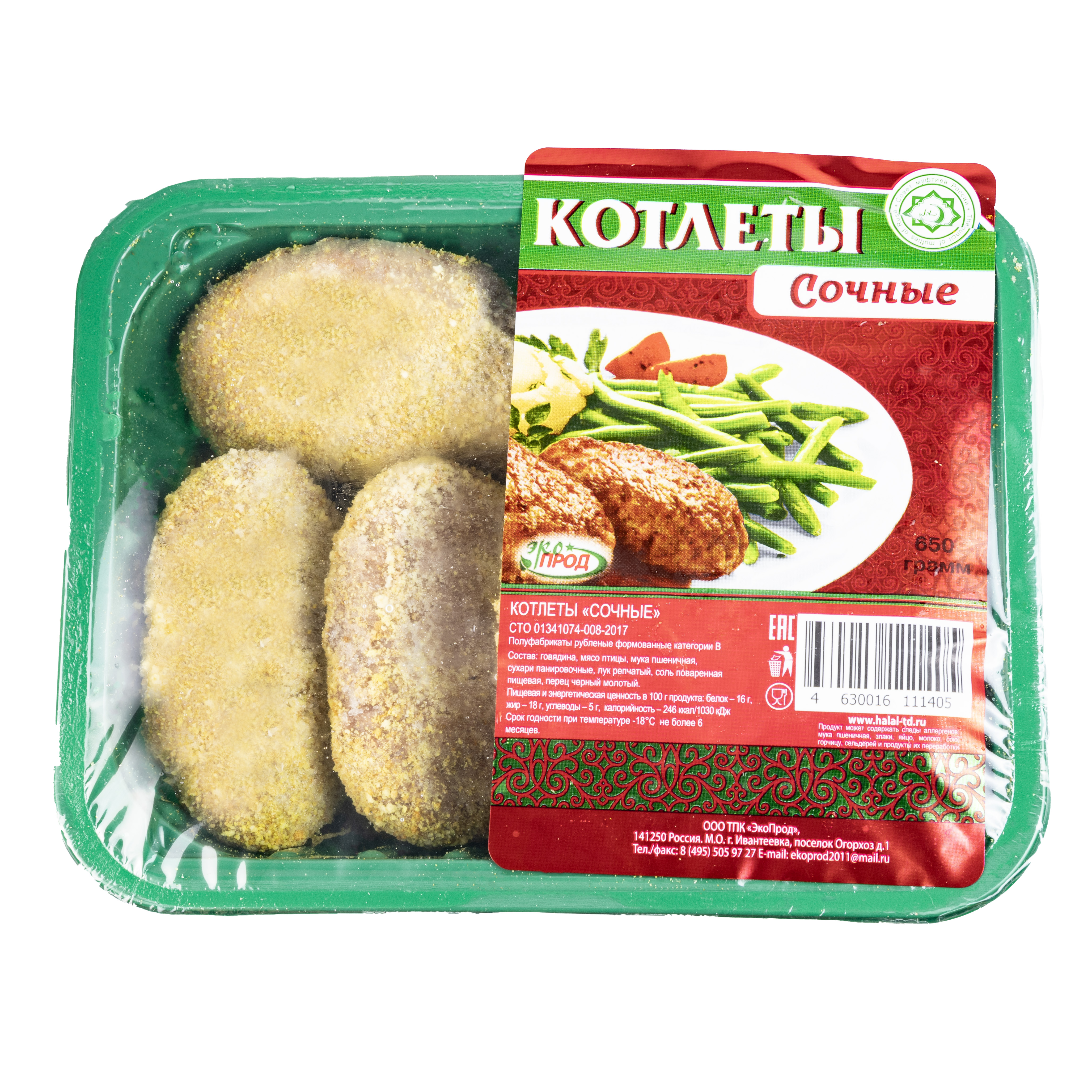 В процессе приготовления фарша для котлет «ЭкоПрод» соблюдались все каноны ислама. В составе нет канонически запрещенных компонентов, котлеты являются халяльным продуктом.