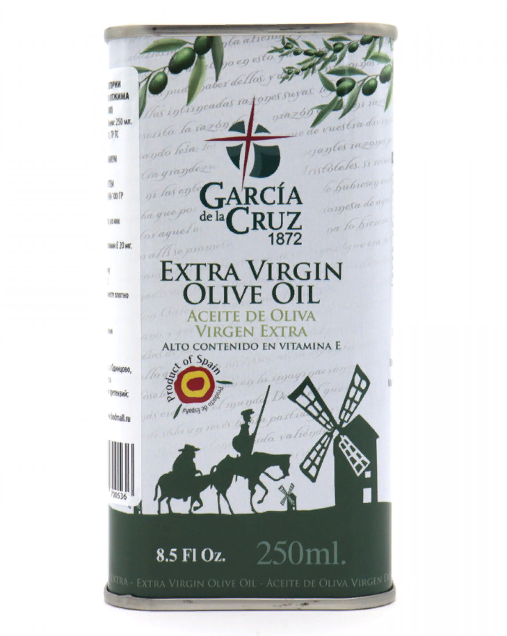 Garcia Extra Virgin производится в Испании. Это натуральное оливковое масло холодного отжима класса «Экстра». Применяется для нежной обжарки морепродуктов, мяса и овощей. В отличие от других видов масел, не выделяет канцерогенов при жарке, не издает неприятных запахов. Также используется для заправки холодных и горячих салатов.