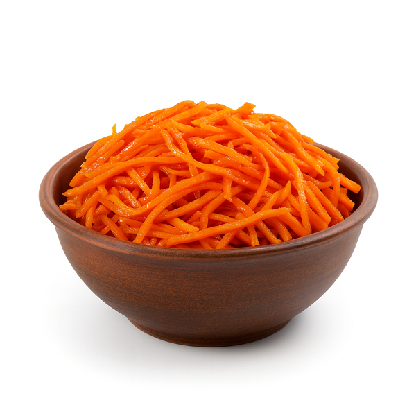 Морковь по-корейски готовится из сочной моркови с яркой оранжевой окраской и различных ароматных сухих специй, придающих моркови пикантный вкус.