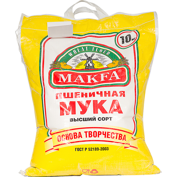 Мука пшеничная Makfa в мешке 10 кг – это единственный продукт, который употребляют все люди на земле, независимо от вероисповедания, цвета кожи и социального статуса. Но мука муке рознь: чтобы соответствовать стандартам высшего сорта, она должна иметь невысокий процент клейковины (не более 28%) и белоснежный цвет. Из такого компонента можно приготовить воздушную и рассыпчатую выпечку с мягким сладковатым вкусом. Хранить муку необходимо обязательно в сухом месте, а перед добавлением в тесто – просеивать через сито. Предлагаем заказать доставку продуктов с рынка и попробовать!