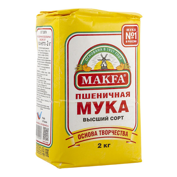 Мука пшеничная Makfa высший сорт 2 кг это единственный продукт, который употребляют все люди на земле, независимо от вероисповедания, цвета кожи и социального статуса. Но мука муке рознь: чтобы соответствовать стандартам высшего сорта, она должна иметь невысокий процент клейковины (не более 28%) и белоснежный цвет. Из такого компонента можно приготовить воздушную и рассыпчатую выпечку с мягким сладковатым вкусом. Хранить муку необходимо обязательно в сухом месте, а перед добавлением в тесто – просеивать через сито. Предлагаем заказать доставку продуктов с рынка и попробовать!
